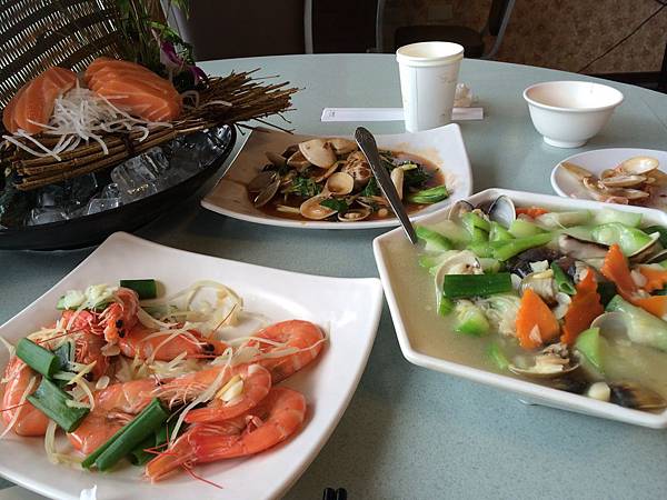 一開始,仍然去櫃檯挑海鮮,基本我愛的就是鮮蝦、炒海瓜子、生魚片,剩下由店員推薦,選了一條不知名的蒸魚,再加一道菜。
