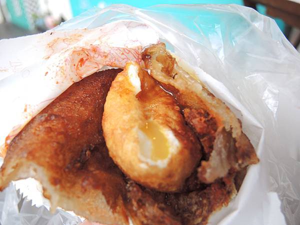 炸蛋蔥油餅確實好吃,一份加蛋約NT.25元,並不算貴,餅皮內包一顆蛋黃未熟的「炸蛋」,咬破後混合餅皮,有一番滋味,不過我們初次吃,倒是吃得很狼狽,蛋黃流得到處都是。