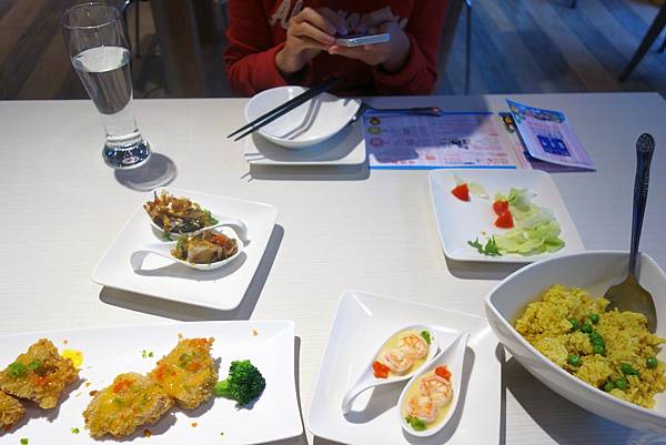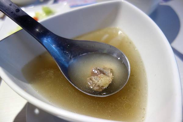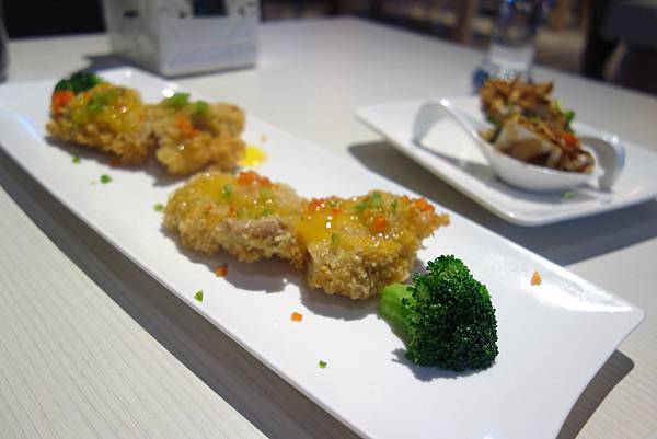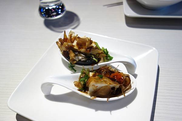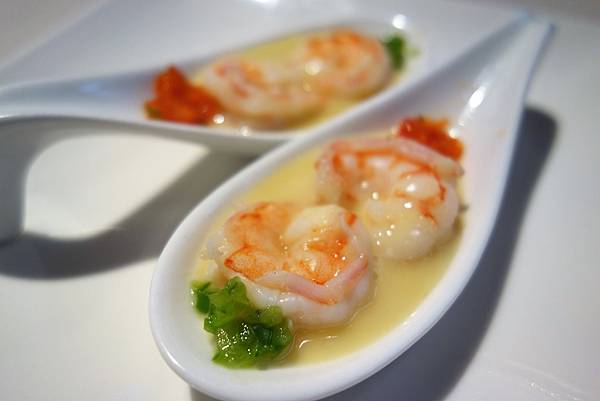 湯匙狀的食器放上一口一個鮮蝦蛋(我亂取名),鮮滑入口,好吃!