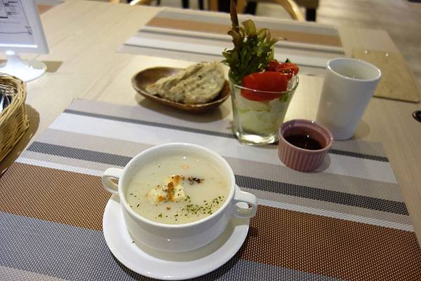 附餐也有沙拉、濃湯,因我不愛吃生菜,也不是很喜歡加醬吃(毛好多啊,哈),但菜真的就是原味蔬菜,新鮮;濃湯則是濃湯(不然呢)