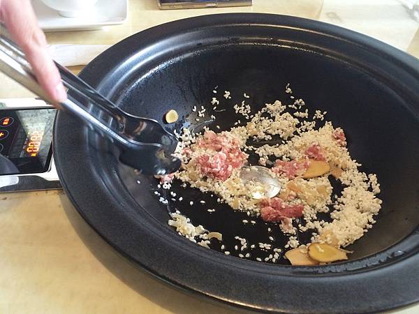 一開始會先將最後一道粥料理放在最底層,一點點油,然後生米、肉片、干貝絲,未加調味料和水。