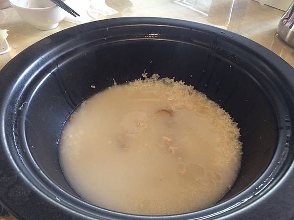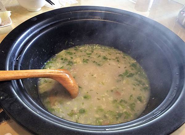 最後則是已經吃不下的干貝瘦肉粥,這時,服務員會加上一些佐料(如香菜、芹菜等)、蛋,配上先前清蒸後的湯汁,其實湯底味道非常鮮,而且米粒熬到與湯汁融合,非常好吃,但最後我們還是選擇了打包,分量十足,幾乎裝了2大碗。
